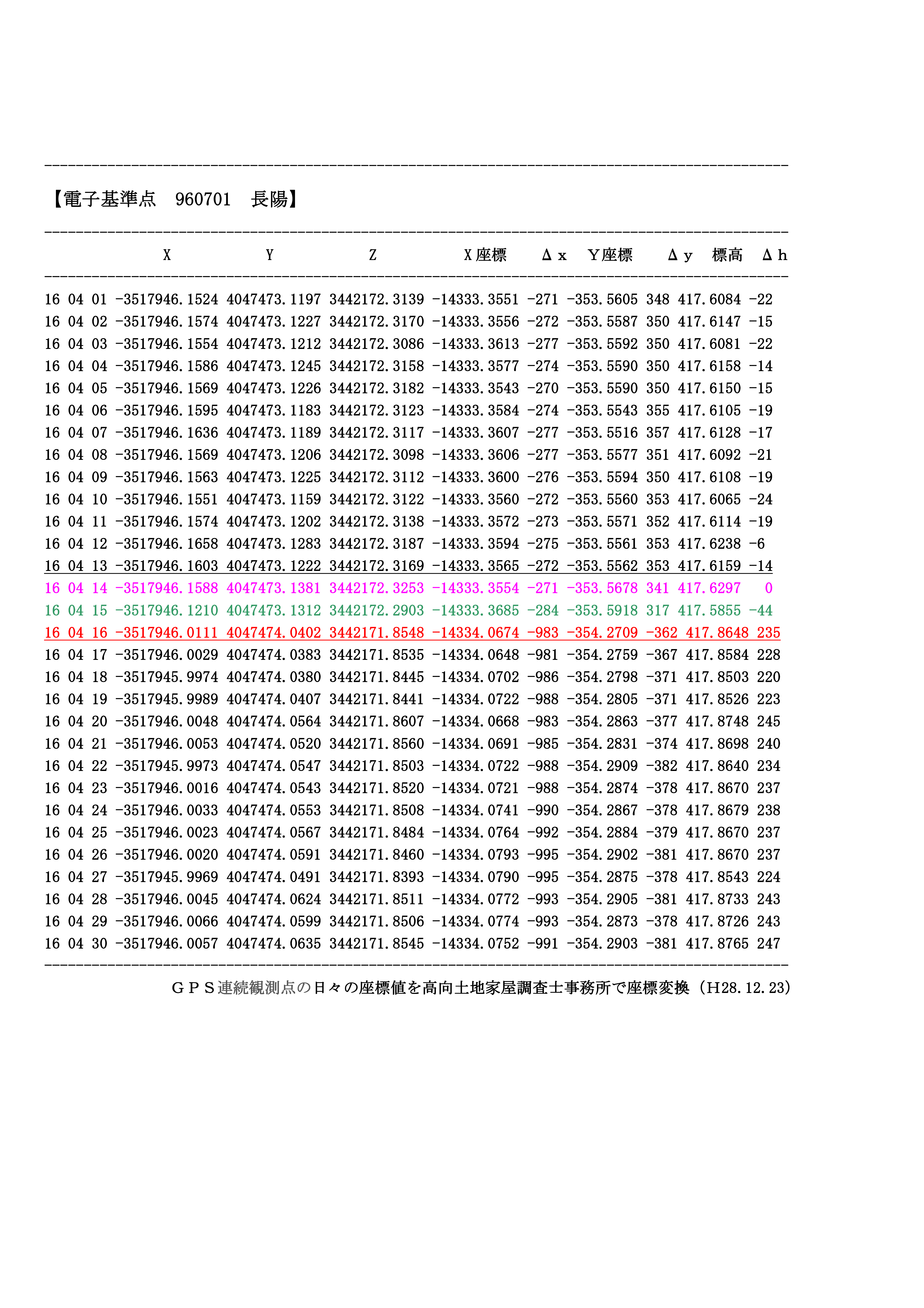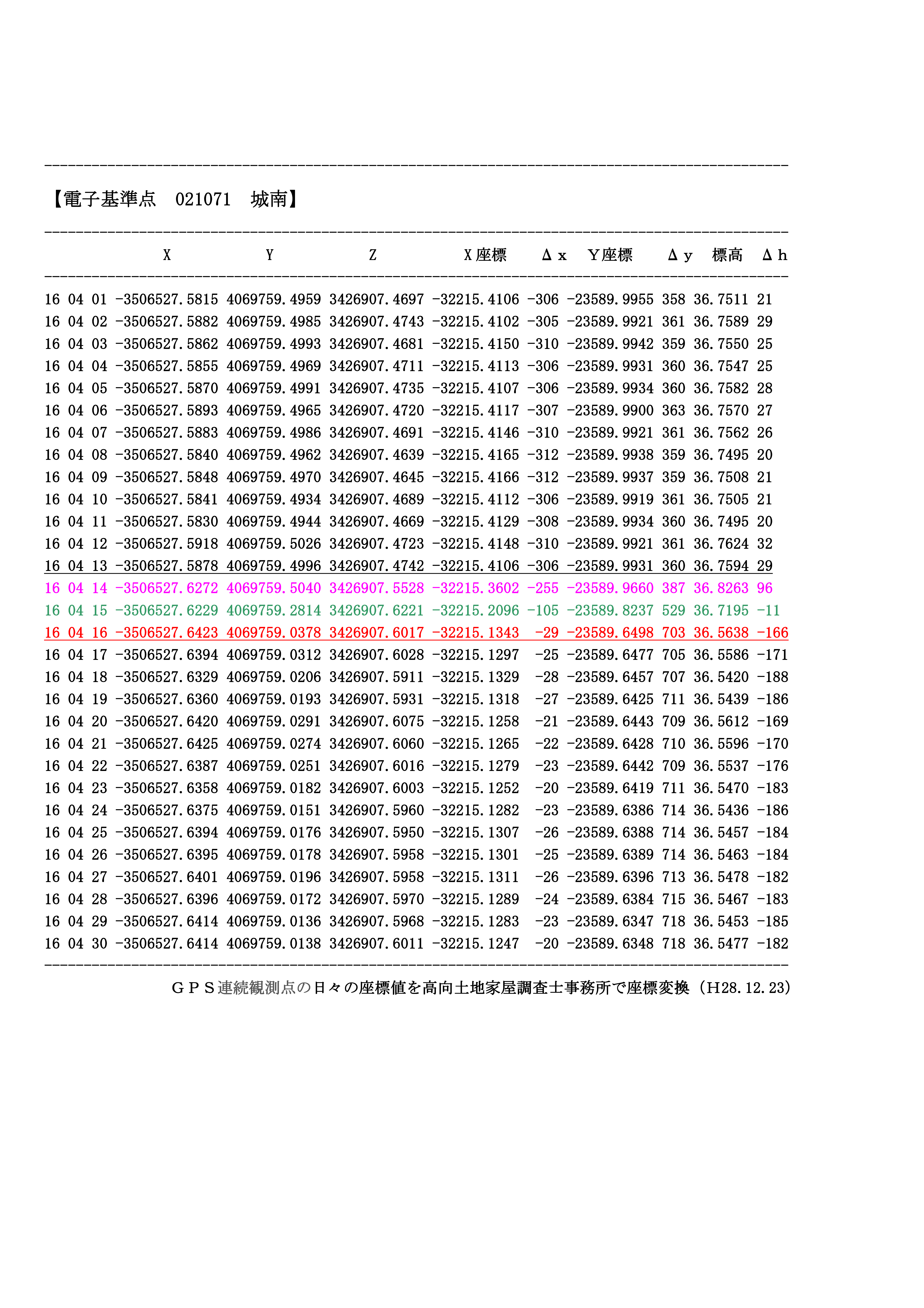 使用データは「GNSS定時観測(JST 21:00)日々の座標値」の【2016年4月13日・14日・15日・16日】を