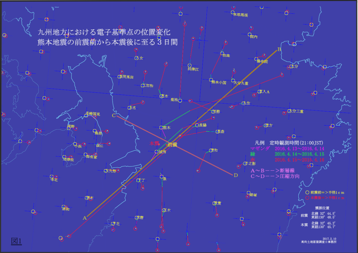 この疑問に3年間、各電子基準点の時系列に沿った位置変位計算を試行錯誤し、以下の結論に達した。